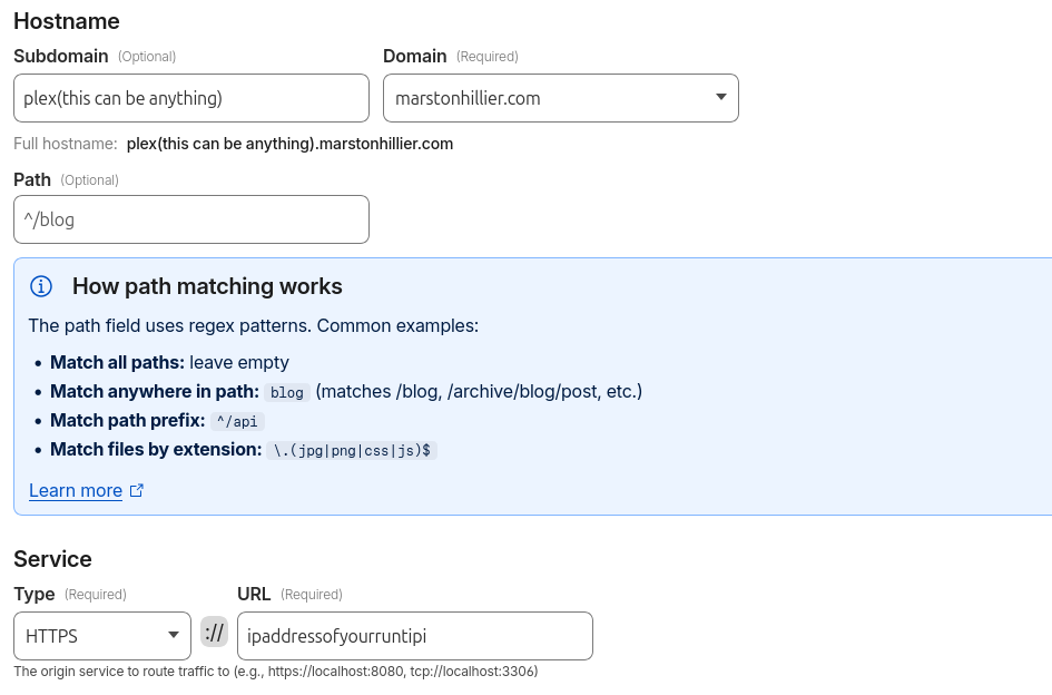 Step 12: Assuming you want to expose the app called "Plex" I would fill it out like this